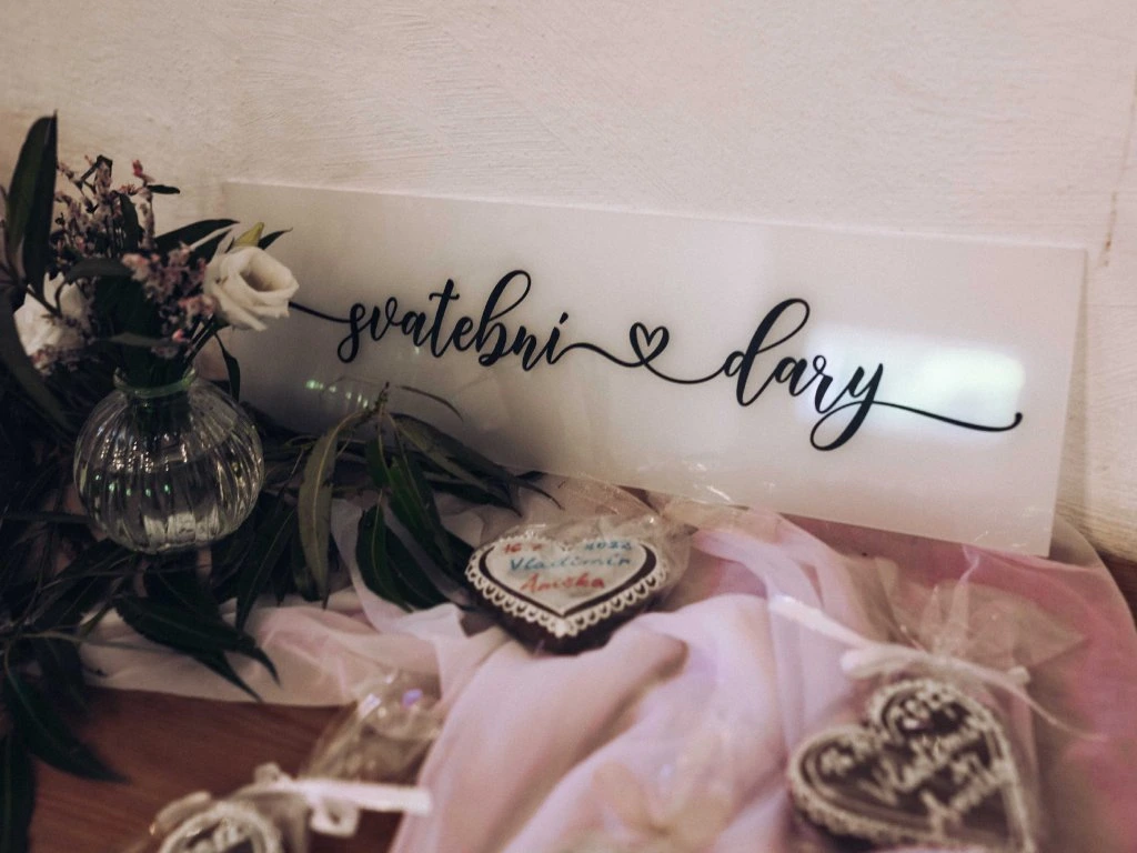 💡 Náš tip: Sjednoťte styl všech svatebních cedulek, aby vaše svatební prostory působily vizuálně sladěně.