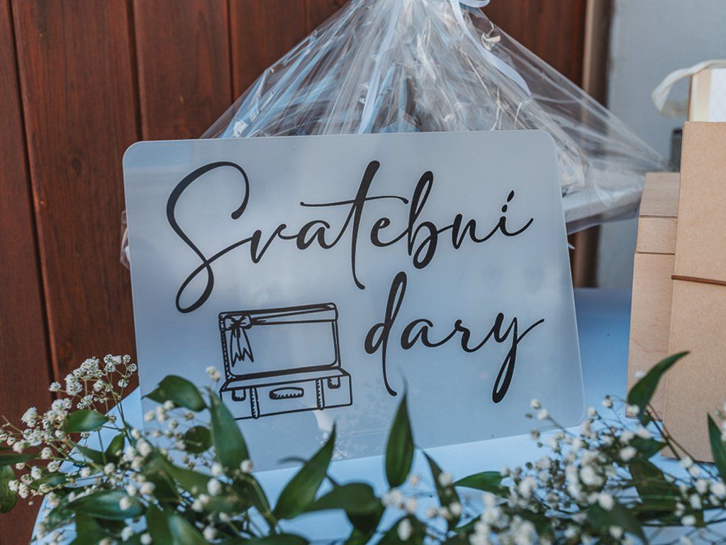 Cedulka - svatební dary 02 – Cedulka Svatební dary perfektně doplní Váš hlavní sál. Hosté budou mít přehledně označené místo, pro svatební dary a budou přesně vědět, kam dary umístit. Díky plexi provedení se skvěle hodí jak do elegantního, tak do přírodního stylu. ✨