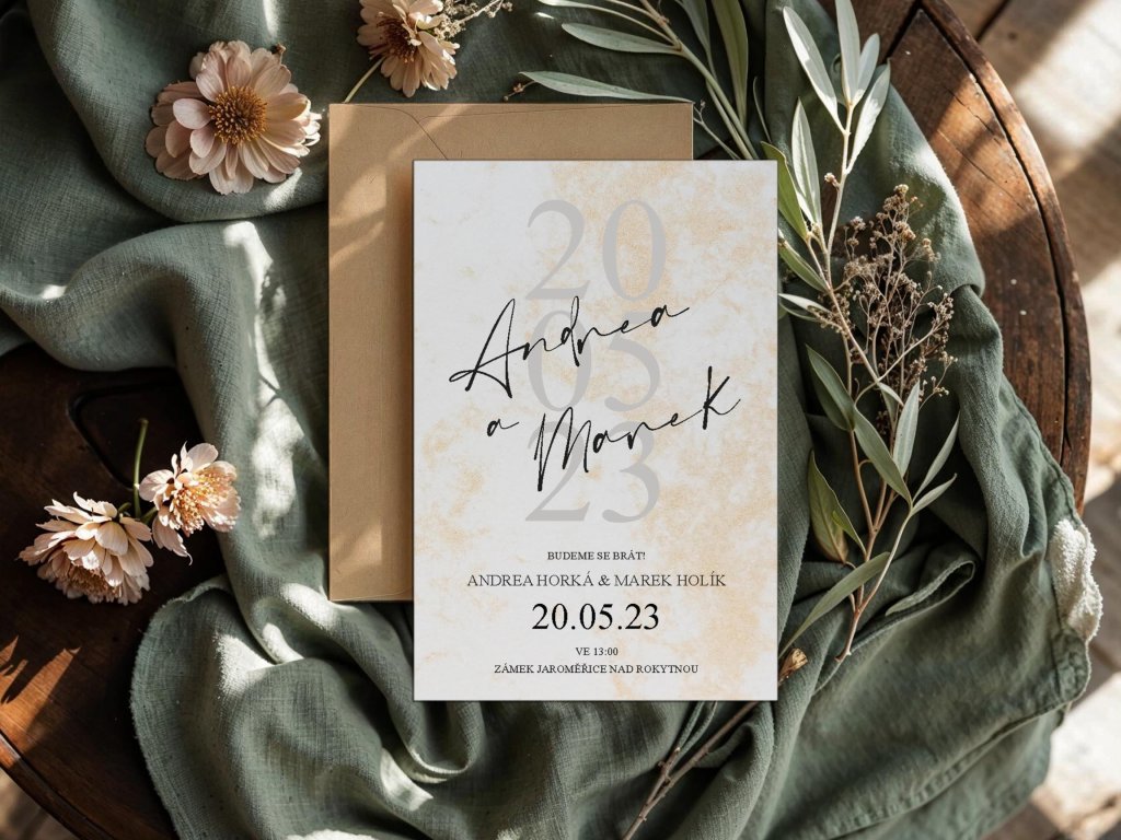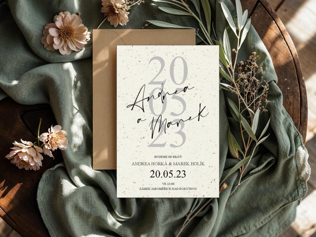 Luxusní svatební oznámení na prémiovém grafickém papíře (220–300 g/m?) vyniká precizním tiskem a elegantním vzhledem. ❤️ Vyberte si design, který dokonale podtrhne styl vaší svatby.