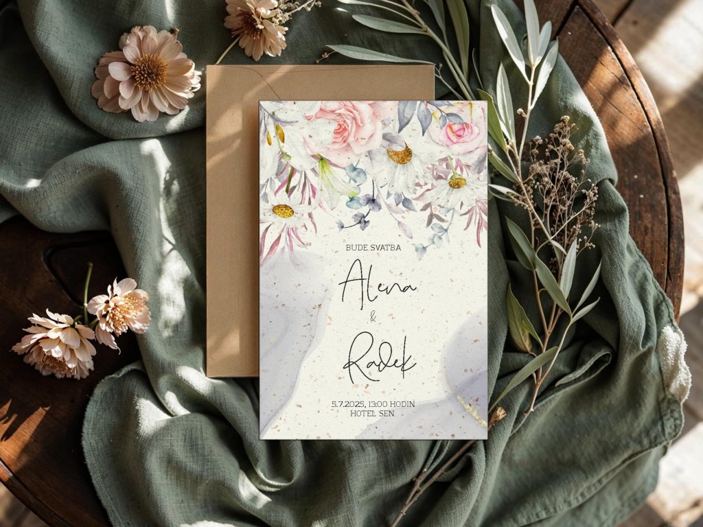 Luxusní svatební oznámení na prémiovém grafickém papíře (220–300 g/m?) vyniká precizním tiskem a elegantním vzhledem. ❤️ Vyberte si design, který dokonale podtrhne styl vaší svatby.