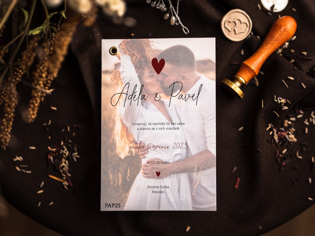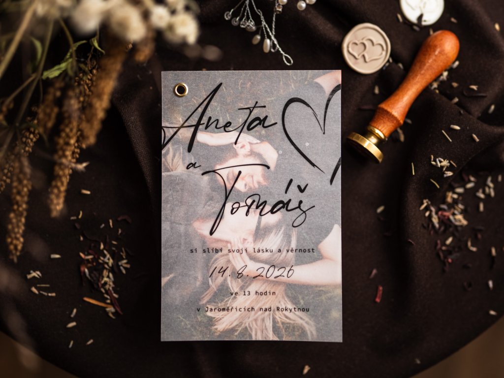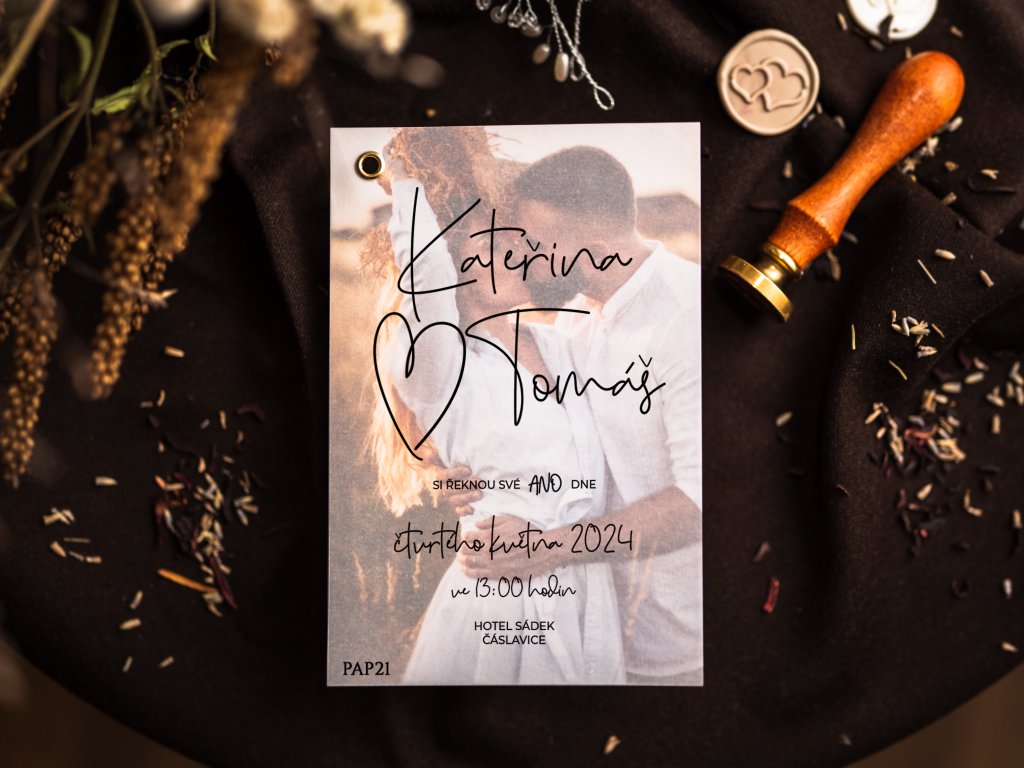 Transparentní svatební oznámení s foto podkladem je vyrobeno z průhledné vrstvy na které jsou informace o Vaší svatbě a ve druhé vrstvě je podklad s Vaší společnou fotografií. Obě vrstvy jsou spojeny elegantním zlatým, stříbrným nebo tmavě šedým nýtkem.