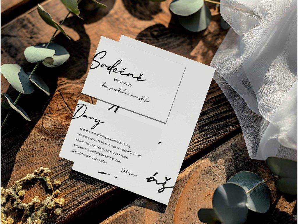 Doporučujeme zakoupit také obálky, kartičky s pozvánkou ke svatebnímu stolu, kartičku se svatebními dary nebo svatební knihu.
