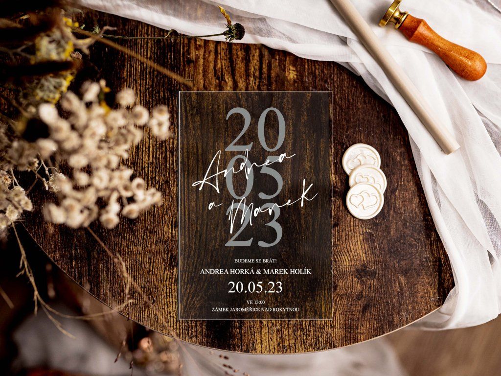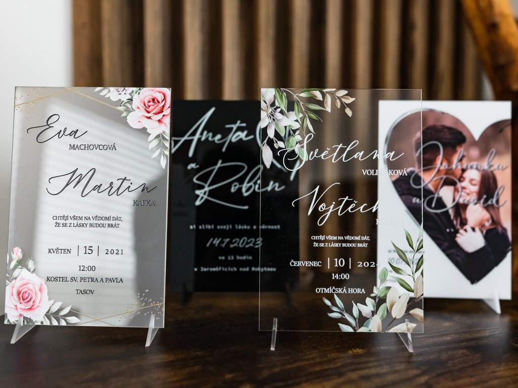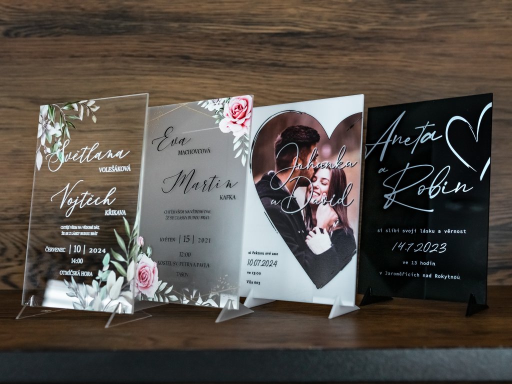 Plexi svatební oznámení tiskneme na profesionální UV tiskárně na pevné plexisklo o tloušťce 2–3 mm. UV potisk zajišťuje vysokou kvalitu, syté barvy a dlouhou odolnost.
