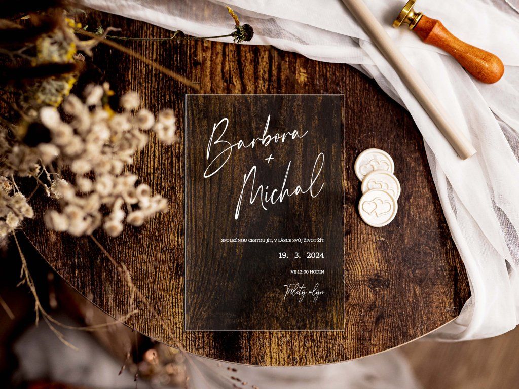 Plexi svatební oznámení tiskneme na profesionální UV tiskárně na pevné plexisklo o tloušťce 2–3 mm. UV potisk zajišťuje vysokou kvalitu, syté barvy a dlouhou odolnost.