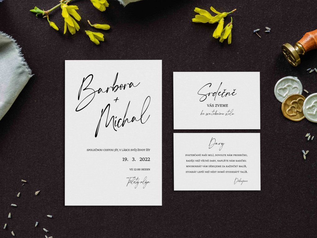 Doporučujeme zakoupit také obálky, kartičky s pozvánkou ke svatebnímu stolu, kartičku se svatebními dary nebo svatební knihu.