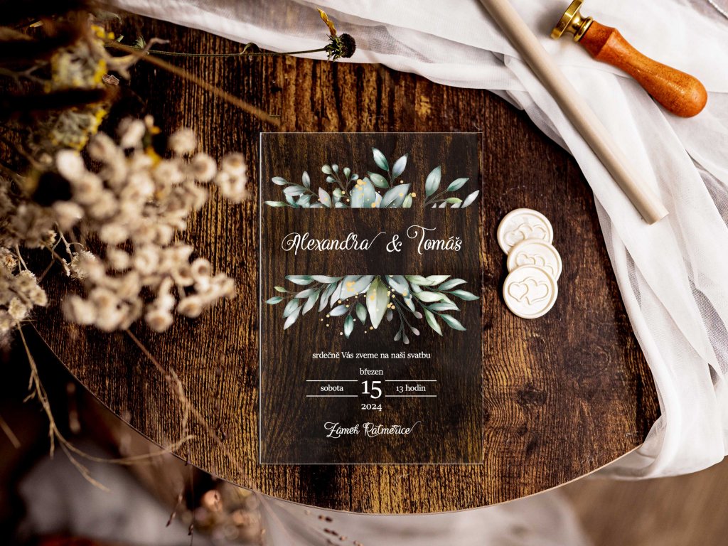 Originální plexi svatební oznámení s moderním designem působí díky kvalitnímu zpracování a materiálu opravdu výjimečně. Průhledné plexi dodá vaší svatbě luxusní a nezapomenutelný vzhled. Nabízíme širokou škálu designů, které přizpůsobíme vašemu stylu – od jemně romantických až po výrazně moderní.
