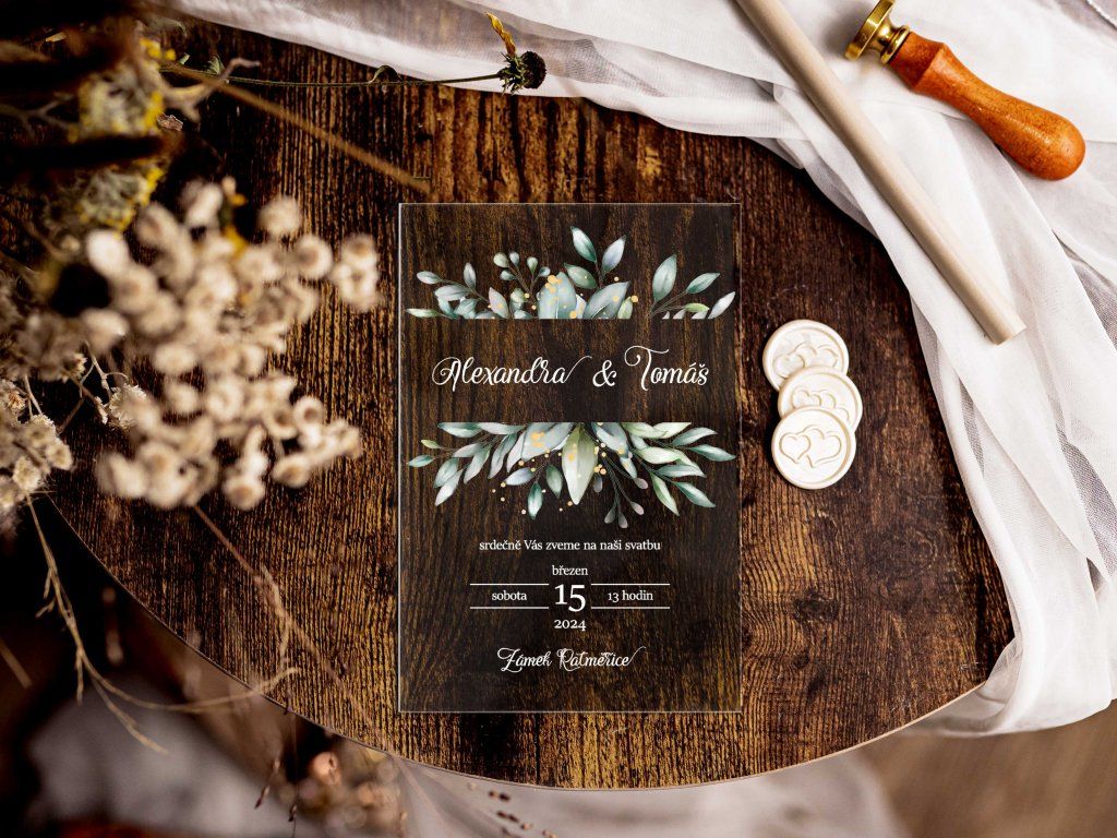 Plexi svatební oznámení tiskneme na profesionální UV tiskárně na pevné plexisklo o tloušťce 2–3 mm. UV potisk zajišťuje vysokou kvalitu, syté barvy a dlouhou odolnost.