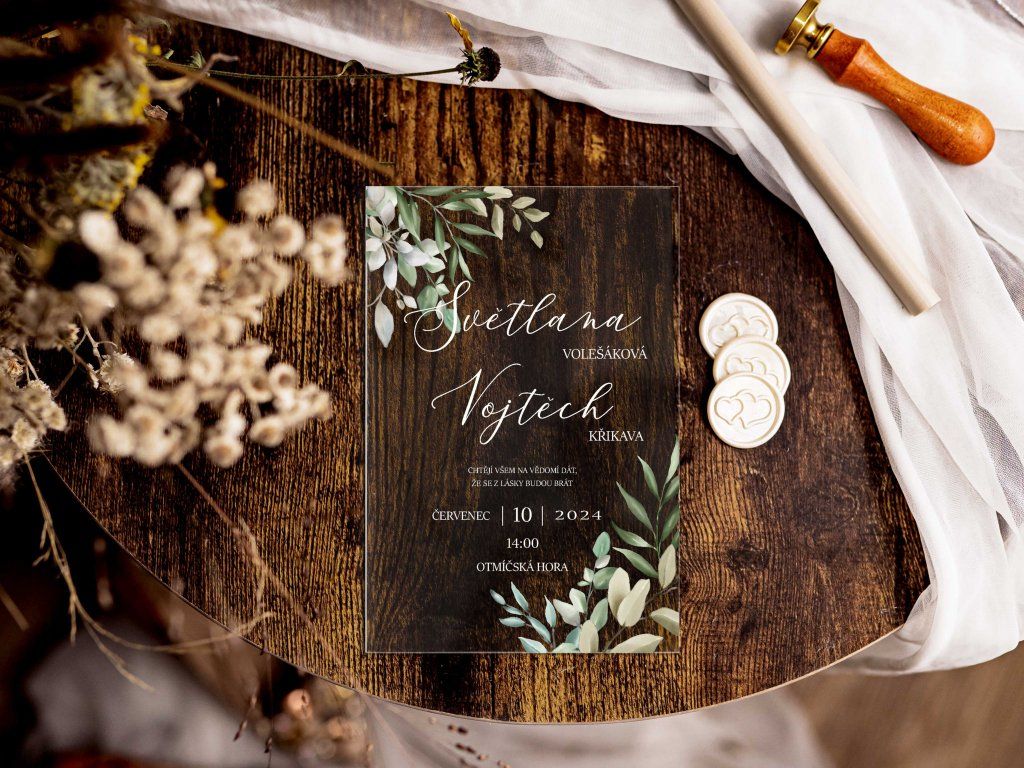 Plexi svatební oznámení tiskneme na profesionální UV tiskárně na pevné plexisklo o tloušťce 2–3 mm. UV potisk zajišťuje vysokou kvalitu, syté barvy a dlouhou odolnost.