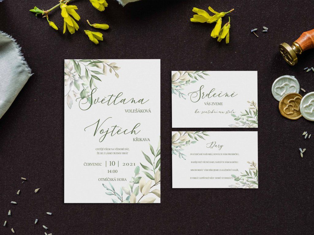Doporučujeme zakoupit také obálky, kartičky s pozvánkou ke svatebnímu stolu, kartičku se svatebními dary nebo svatební knihu.