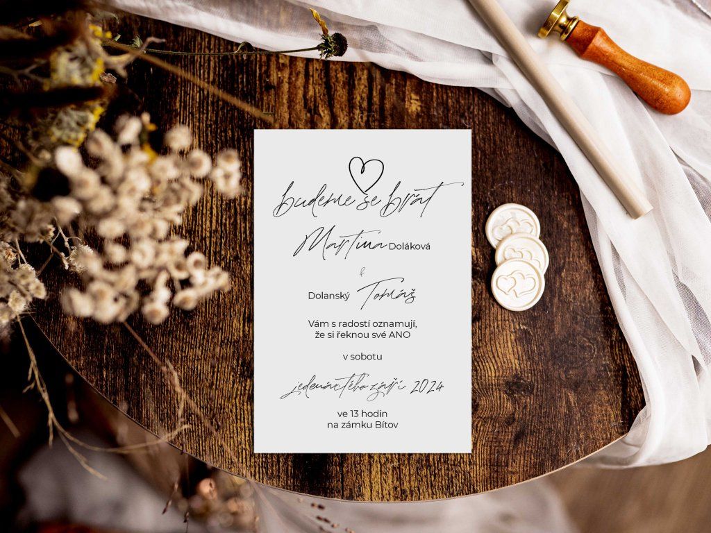 Všechny svatební tiskoviny vám sladíme do jednotného stylu – oznámení, menu, jmenovky, zasedací pořádek i další doplňky. Díky tomu bude celý svatební den působit krásně harmonicky a promyšleně.