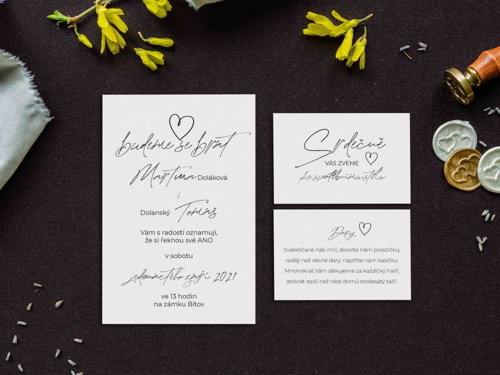 Doporučujeme zakoupit také obálky, kartičky s pozvánkou ke svatebnímu stolu, kartičku se svatebními dary nebo svatební knihu.