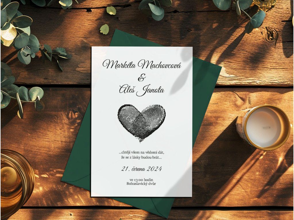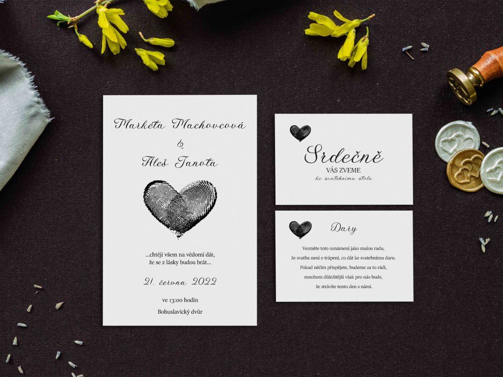 Doporučujeme zakoupit také obálky, kartičky s pozvánkou ke svatebnímu stolu, kartičku se svatebními dary nebo svatební knihu.