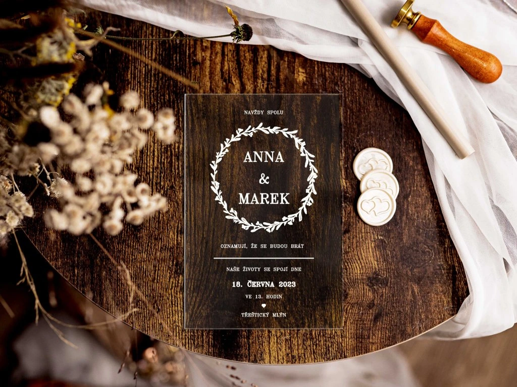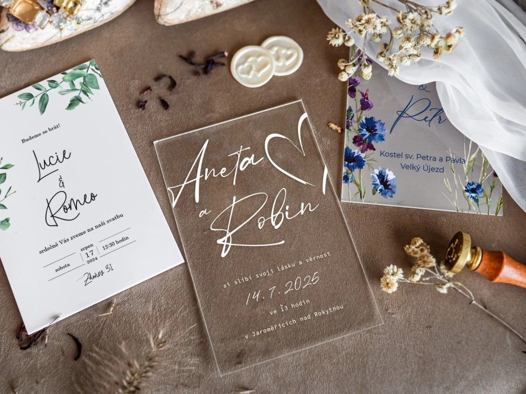 Plexi svatební oznámení tiskneme na profesionální UV tiskárně na pevné plexisklo o tloušťce 2–3 mm. UV potisk zajišťuje vysokou kvalitu, syté barvy a dlouhou odolnost.