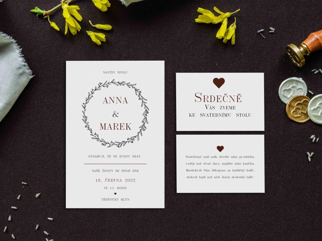 Doporučujeme zakoupit také obálky, kartičky s pozvánkou ke svatebnímu stolu, kartičku se svatebními dary nebo svatební knihu.