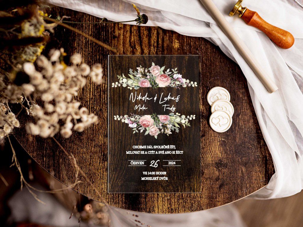 Plexi svatební oznámení tiskneme na profesionální UV tiskárně na pevné plexisklo o tloušťce 2–3 mm. UV potisk zajišťuje vysokou kvalitu, syté barvy a dlouhou odolnost.