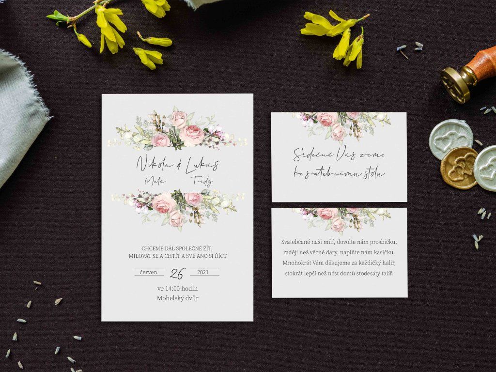 Doporučujeme zakoupit také obálky, kartičky s pozvánkou ke svatebnímu stolu, kartičku se svatebními dary nebo svatební knihu.