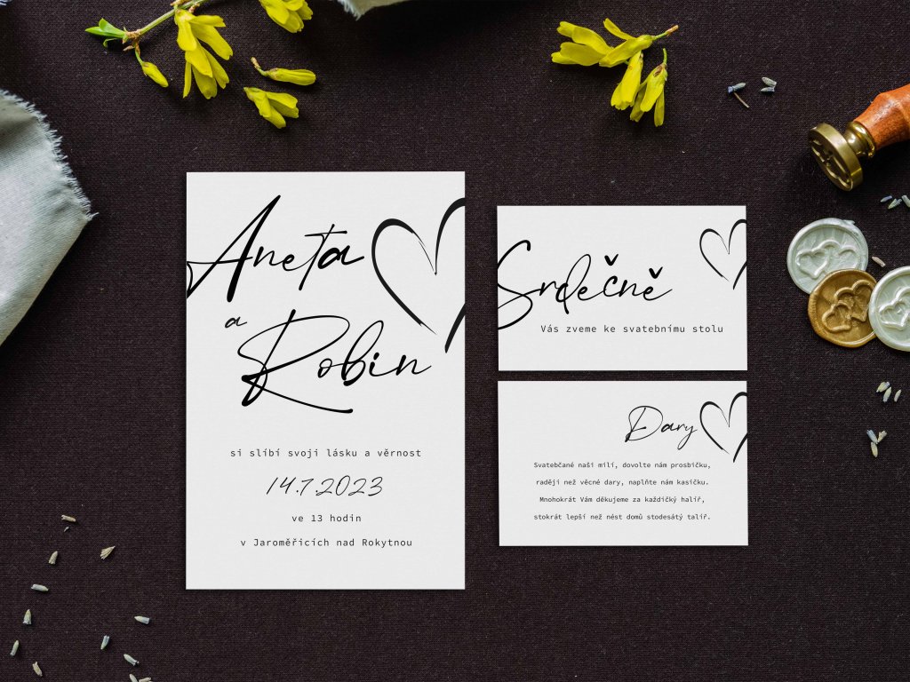 Doporučujeme zakoupit také obálky, kartičky s pozvánkou ke svatebnímu stolu, kartičku se svatebními dary nebo svatební knihu.