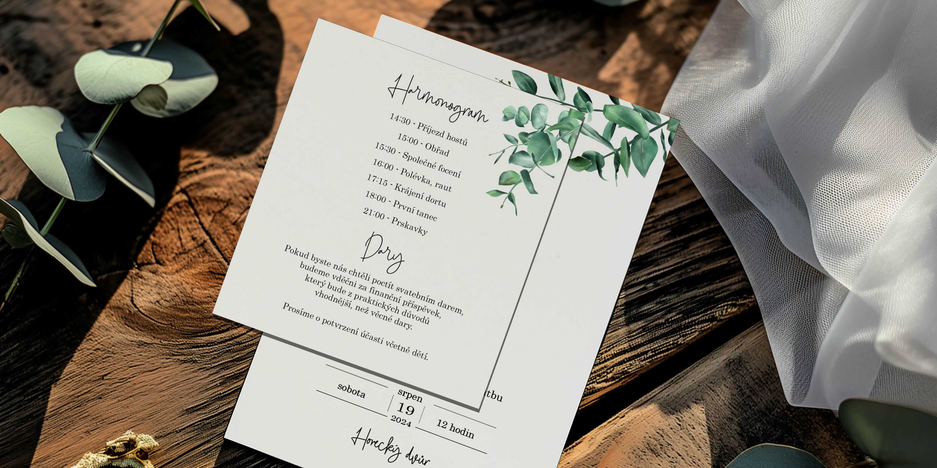 Doporučujeme doladit kartičku s dalšími tiskovinami – pozvánkou ke stolu, kartičkou o darech nebo svatební knihou.