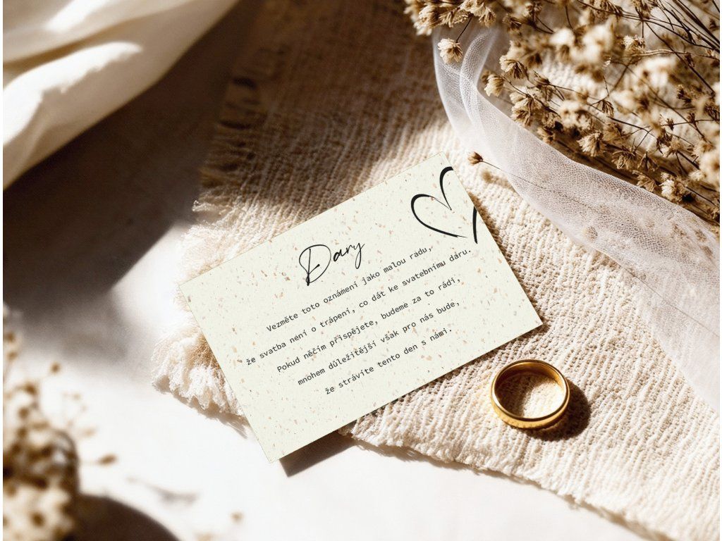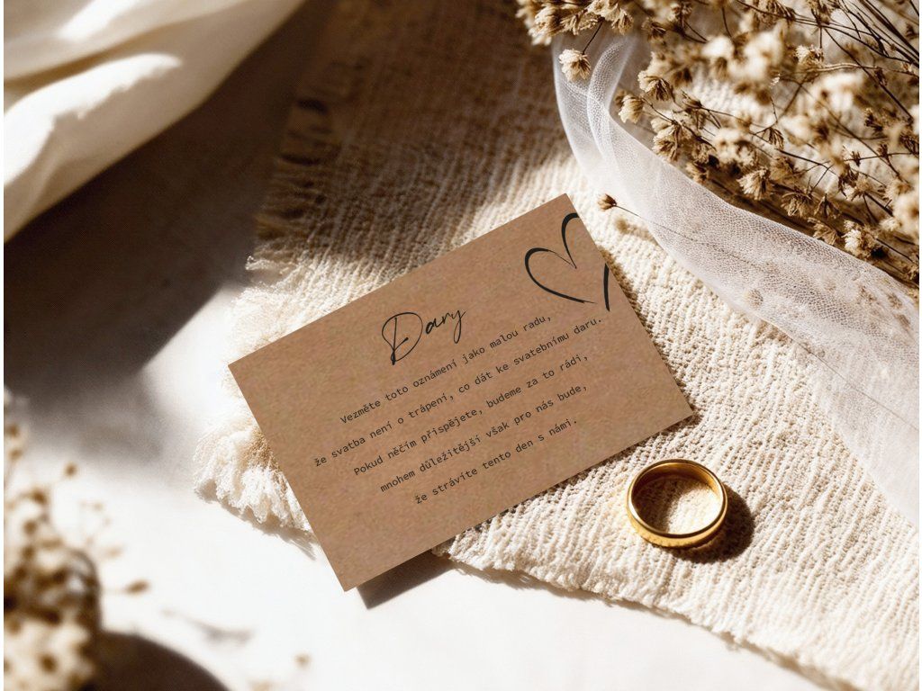 Kartička Svatební dary je elegantní a praktický doplněk ke svatebnímu oznámení i pozvánce ke stolu. Hostům jemně a přehledně sdělí, jaké dary si přejete, nebo zda preferujete finanční příspěvek na vaši společnou cestu životem. ✨