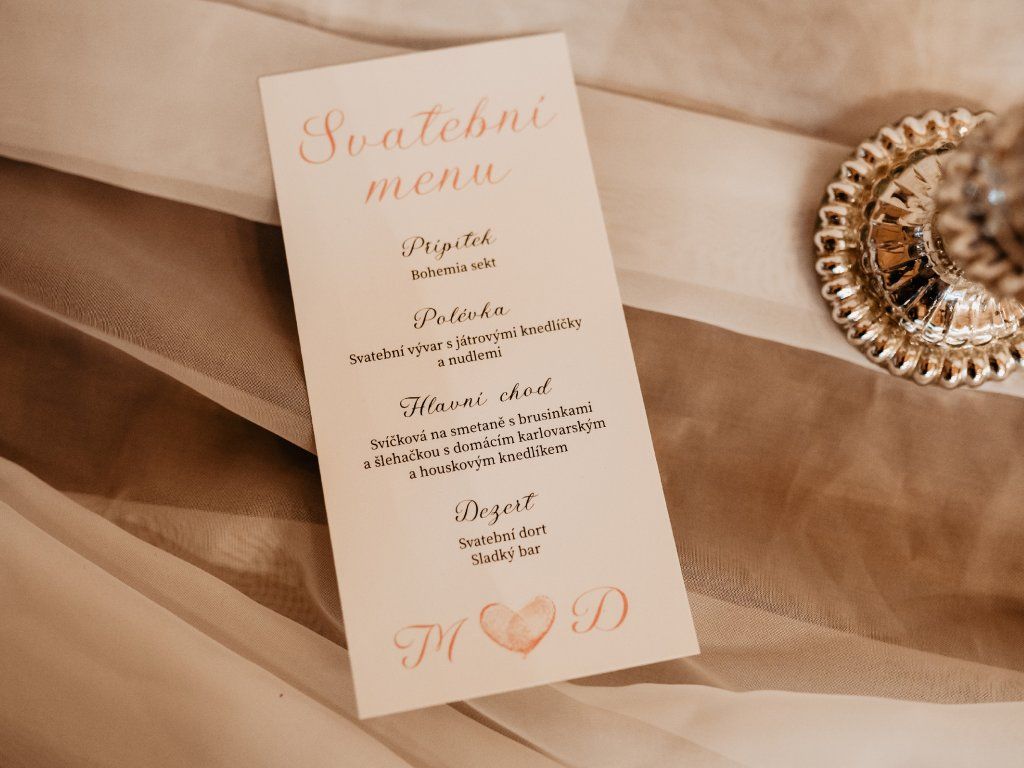 Svatební menu na hostině je důležitým detailem, který hostům zpříjemní posezení u stolu a zároveň slouží jako krásná dekorace. Naše papírová menu vytváříme v jednotném designu s vaším oznámením, aby celá tabule působila harmonicky, promyšleně a luxusně. ❤️